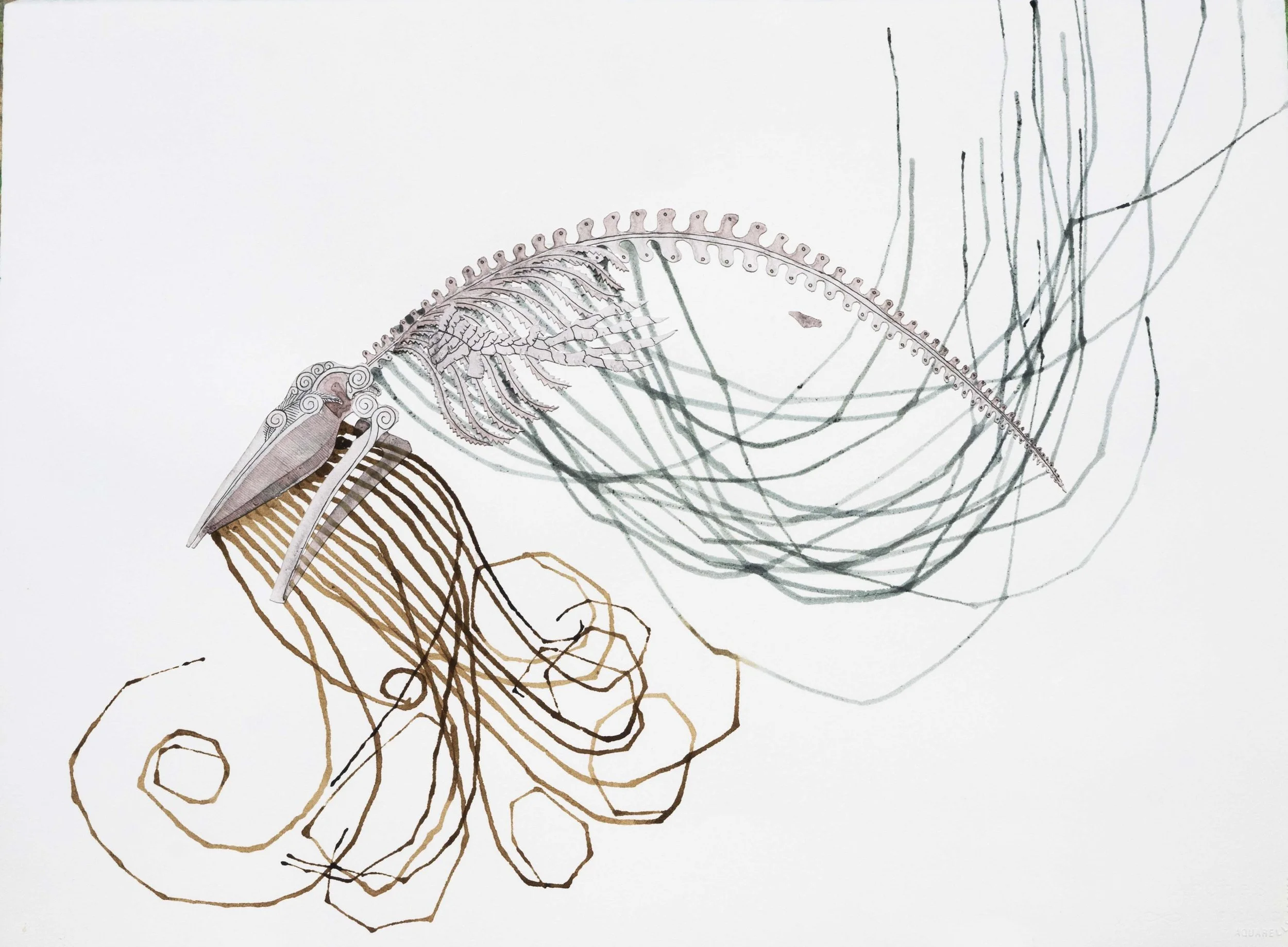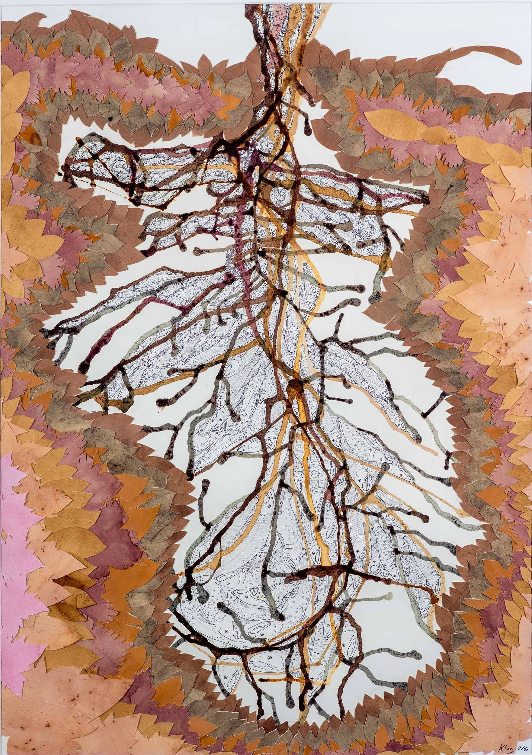 Each of the Olympica paintings are constructed from cut paper, ink and the juice of native berries to create ecological allegories. The work celebrates the beauty and spontaneity of water by painting with droplets of pigment - exploring how the punctuation, duration and direction of water shapes life and a shared environment.